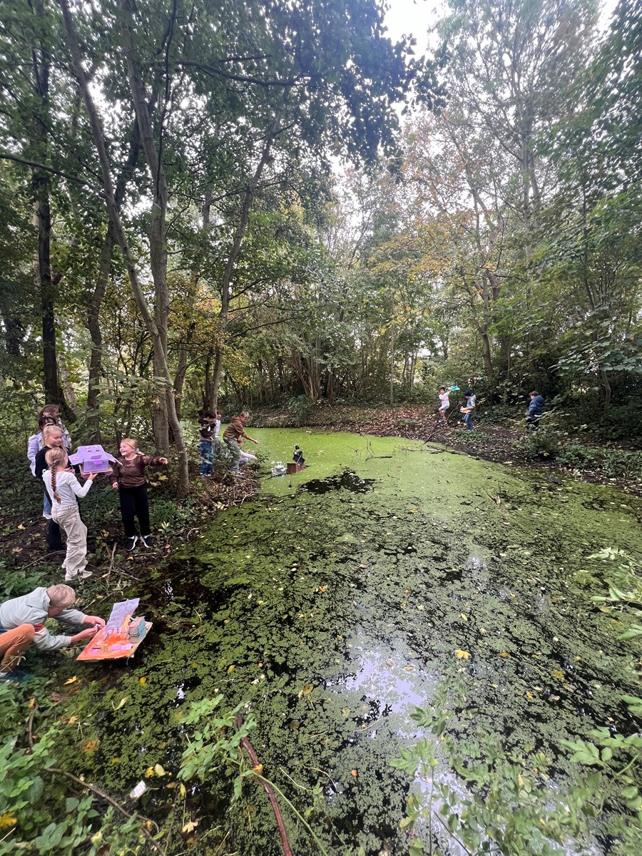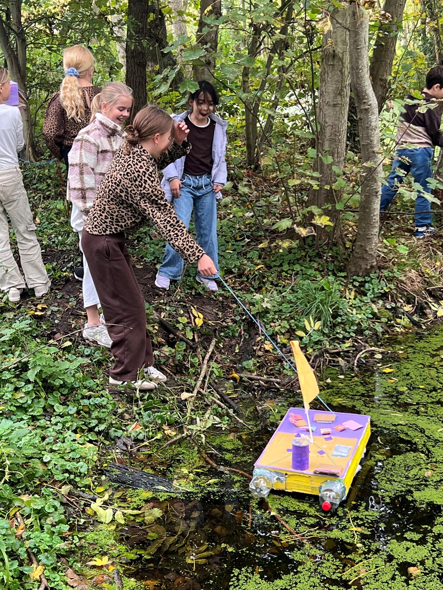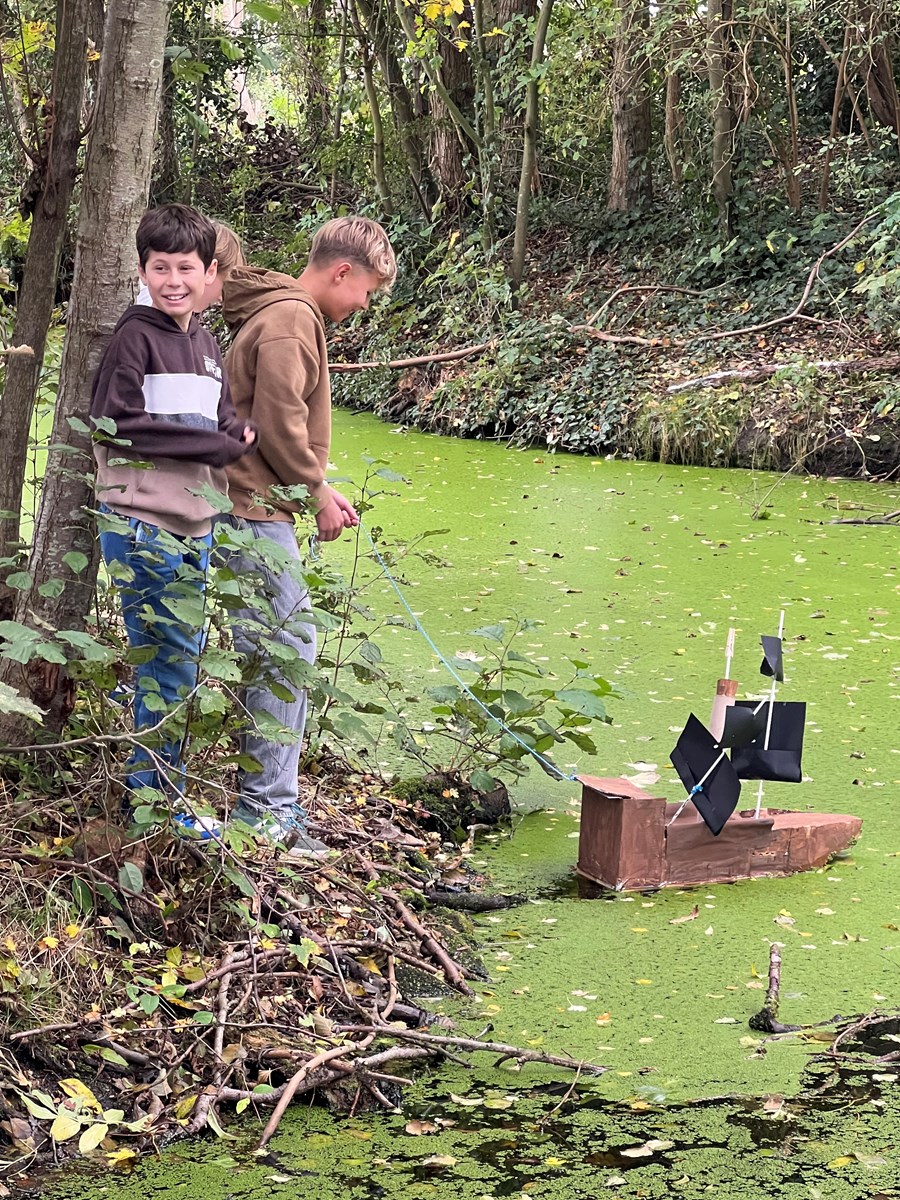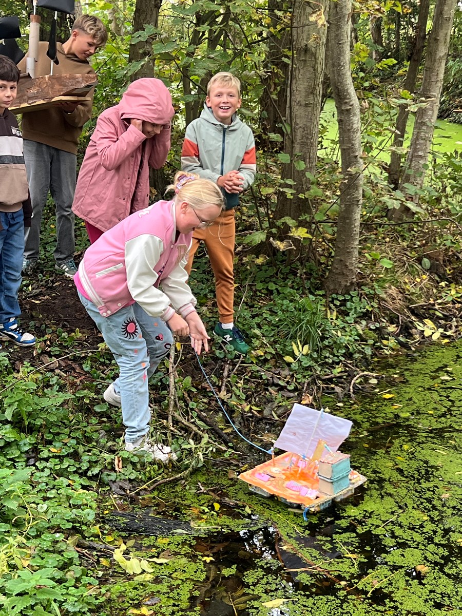 In groepjes bouwden de kinderen hun eigen schip: van zeilboten tot piratenschepen en cruiseschepen. Daarbij dachten ze na over materiaalgebruik, evenwicht en drijfkracht — en gisteren kwam het grote moment: de proefvaart op de eendenvijver!