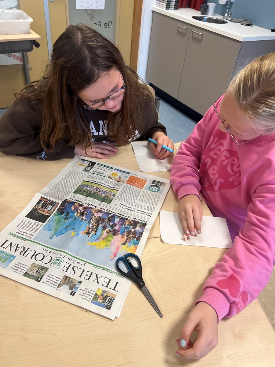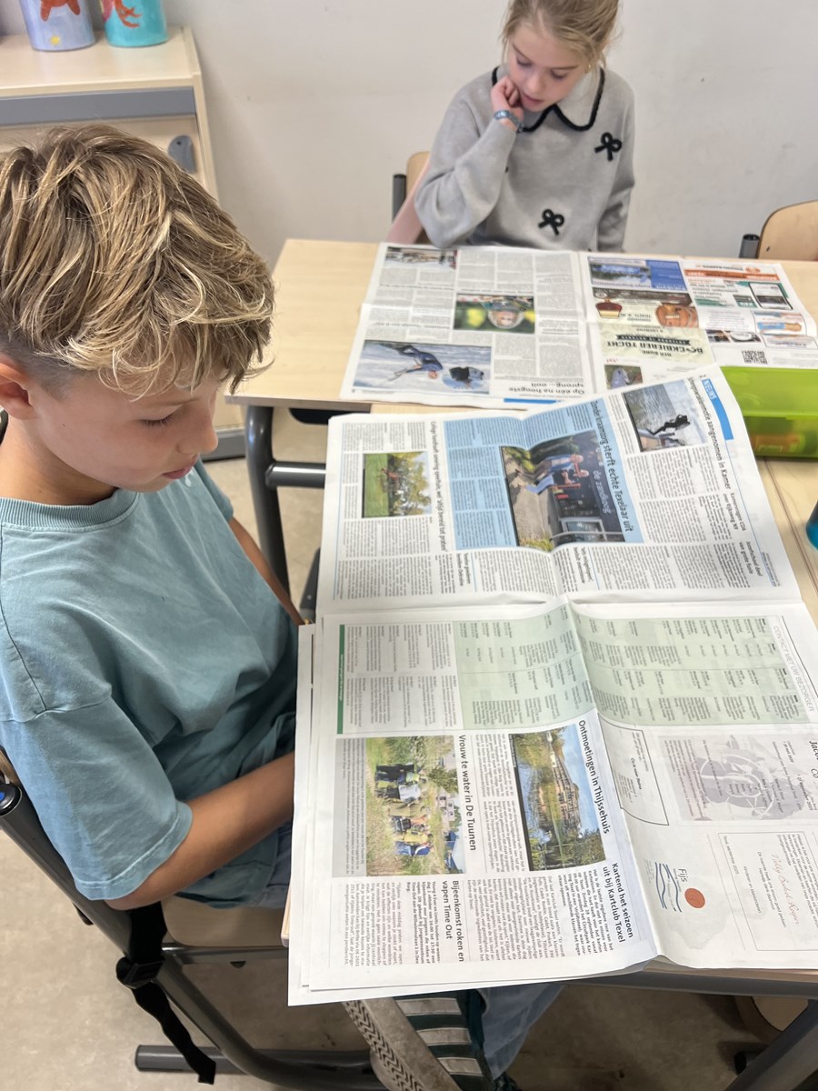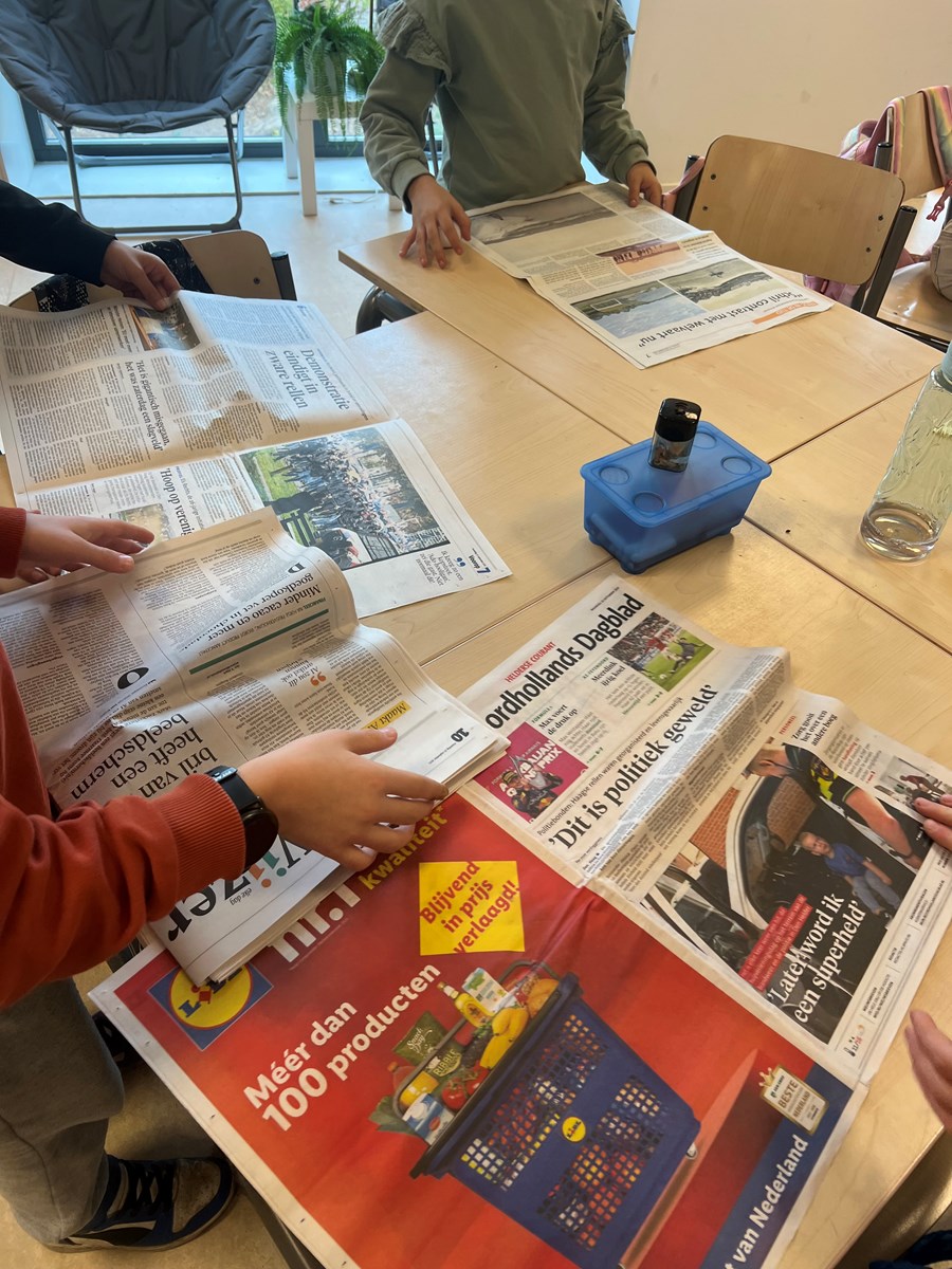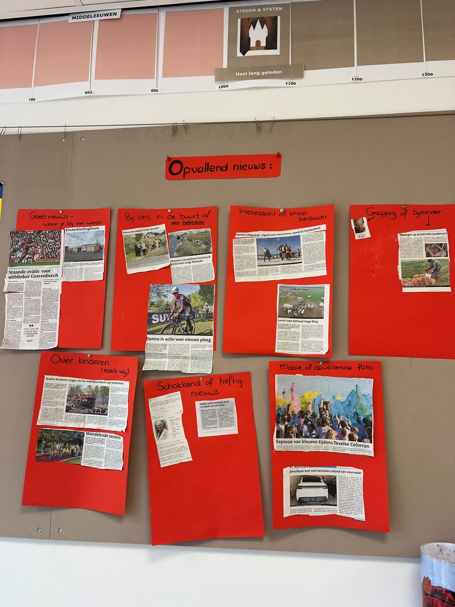 Met kranten in de hand gingen de leerlingen op zoek naar artikelen die hen raakten of opvielen. Op onze nieuwsmuur in de klas zie je nu allerlei berichten die we aan elkaar hebben gepresenteerd. We hebben de artikelen opgedeeld in verschillende categorieën: Waarom valt dit nieuws ons op?