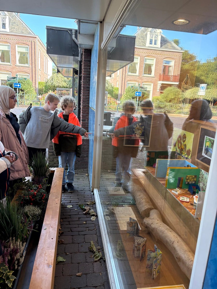 Afgelopen dinsdag zijn we met de klas even naar Nauta Boek gelopen. In de etalage van Nauta boek is een expositie van Mick te zien. Samen met kunstenaar Maurice heeft hij hier aan gewerkt. Alles rondom Vincent van Gogh. Mick heeft er in de klas al iets over verteld en bij de etalage konden de kinderen ook nog vragen aan hem stellen. Wat een prachtig werk heb je gemaakt Mick!