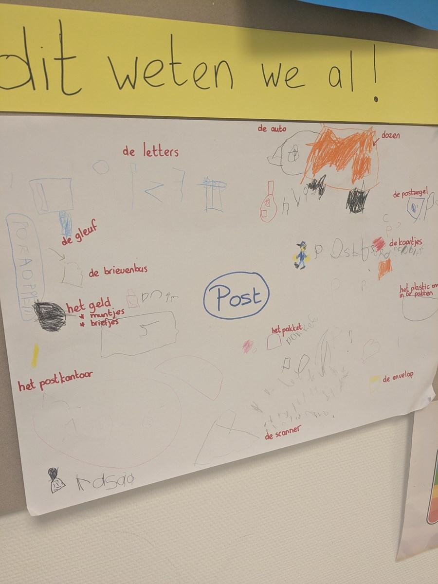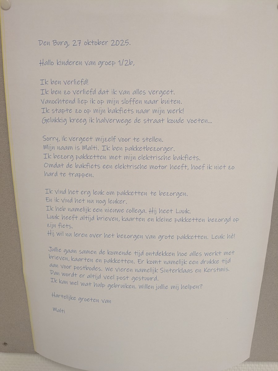 De drukke decembermaand komt eraan. Sinterklaas en zijn pieten zijn onderweg en daarna vieren we massaal Kerst. Als postbezorger Malti ons dan ook vraagt om onze hulp dan is er geen enkele twijfel bij de kinderen. We hebben eerst gekeken wat we allemaal al weten door het maken van een woordweb, waar de één tekent, krabbelt de ander en weer een ander schrijft al de eerste woordjes. Vanuit daar weten we wat we nog moeten leren. In de klas maken we gebruik van boekjes, materialen, filmpjes en daarnaast hebben we ook nog bezoek gekregen van een echte postbode. Dit alles zorgt ervoor dat we steeds meer weten en straks klaar zijn om de Pieten ook echt te gaan helpen!