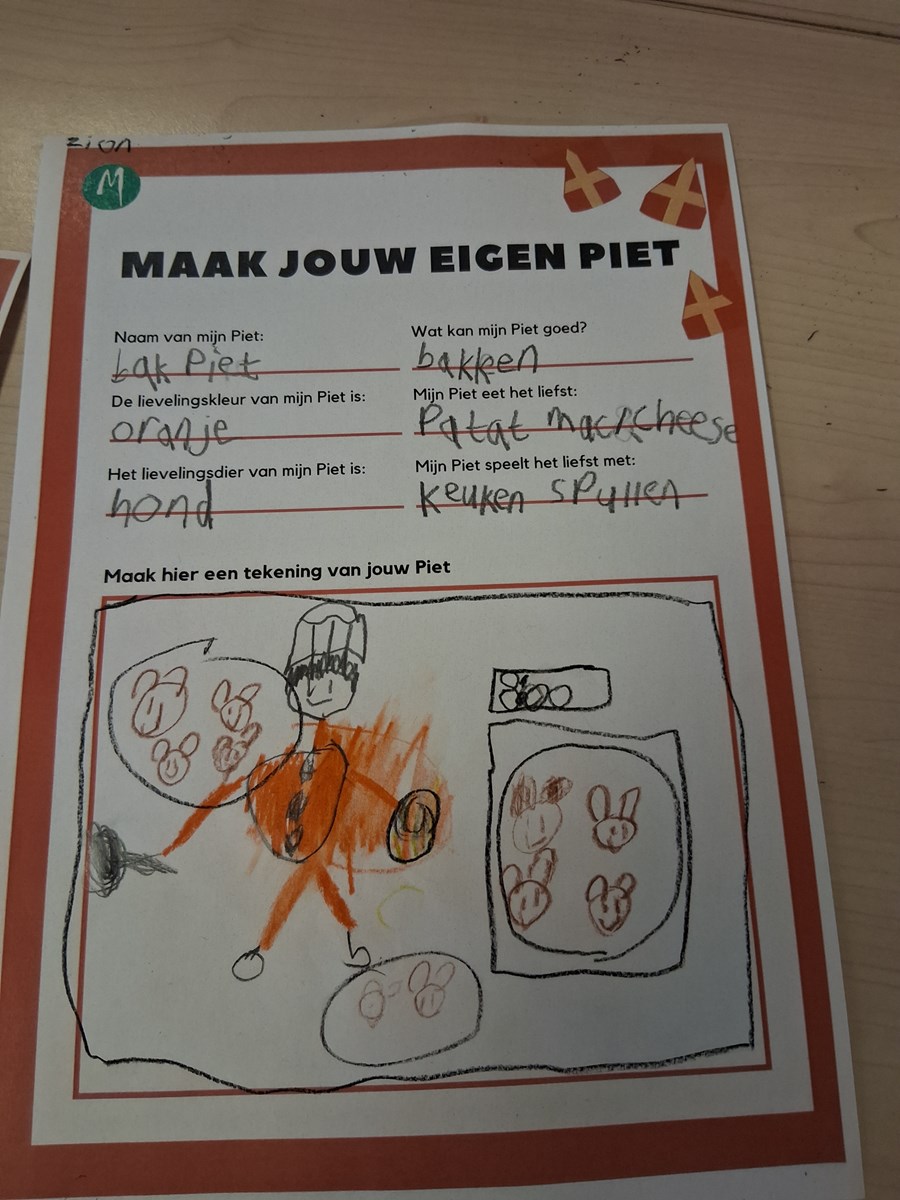 We maken allemaal een kamer voor het Pietenhuis. We schrijven eerst op wat onze Piet met zijn kamer wil: Er ontstaat een machinekamer, een keuken of een stal! De kinderen bedenken zelf hoe ze de voorwerpen in de kamer vormgeven. En het wordt zo mooi!