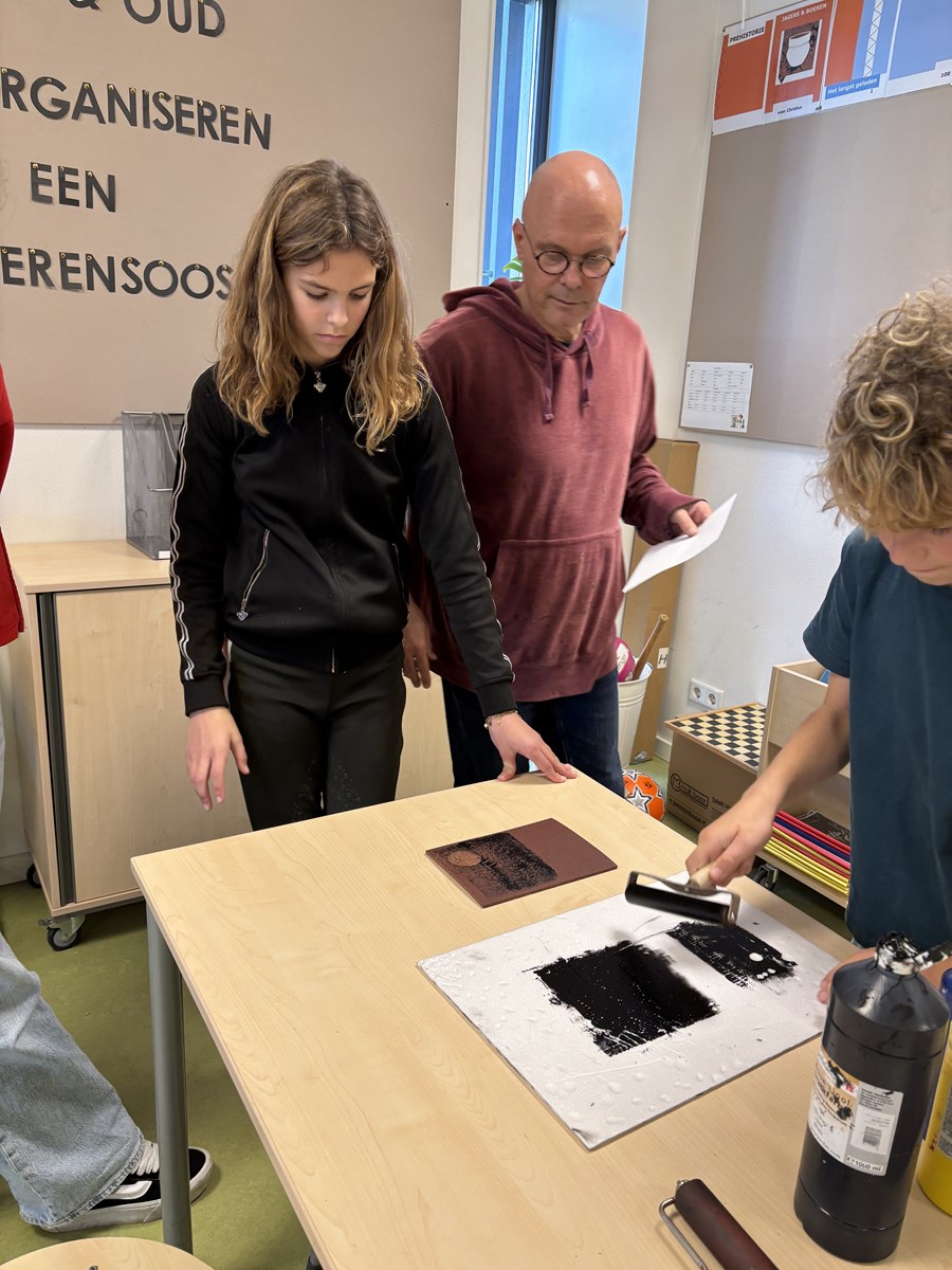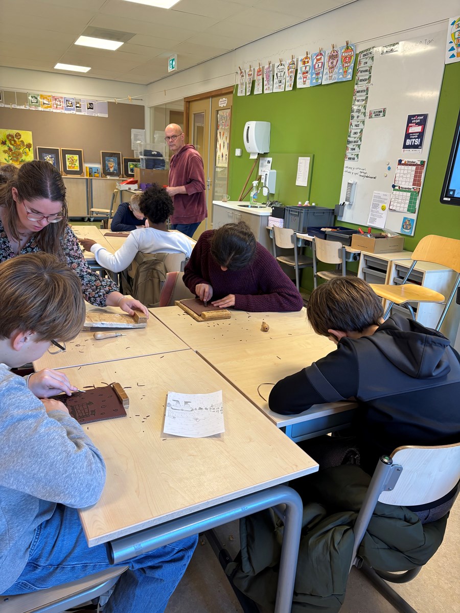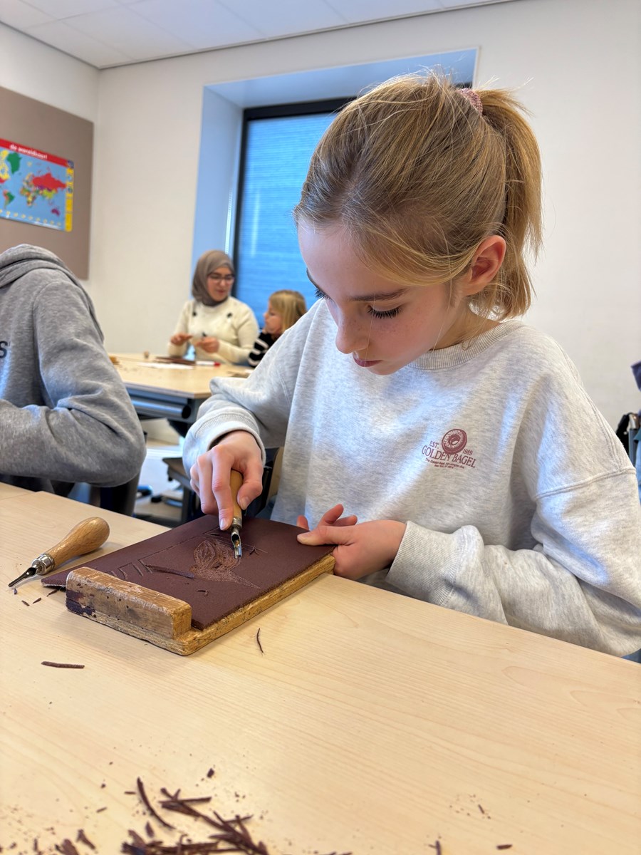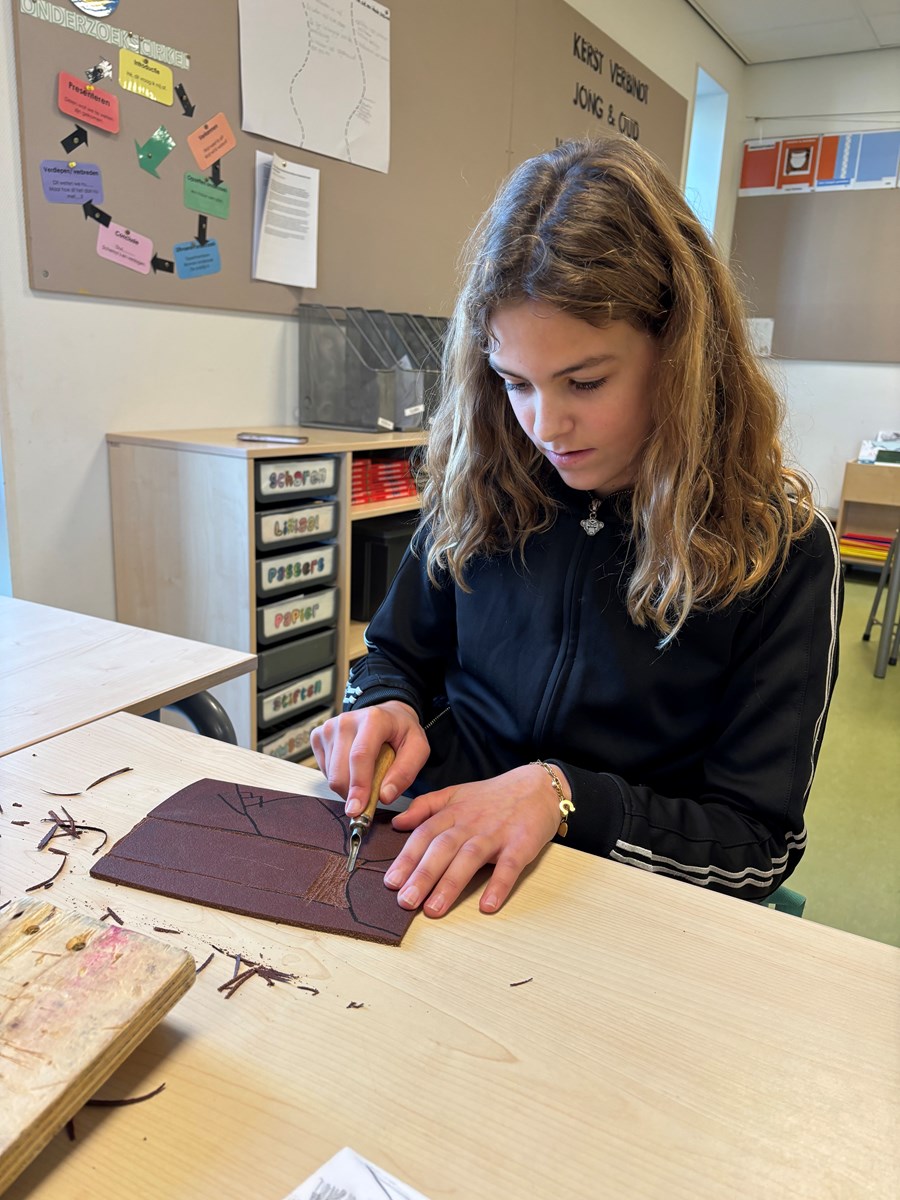 Er hing een ontspannen sfeertje in de klas en iedereen was lekker aan het gutsen. Soms even een bot mesje, waardoor het heel zwaar was, maar die konden snel vervangen worden. Veel kinderen vonden het geweldig!